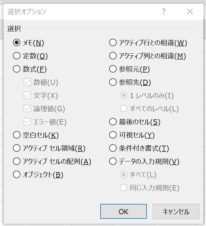 SpecialCellsはExcelのCtrl+Gで表示されるジャンプダイアログボックスのセル選択ボタンをしたときに指定できるセルを表します。