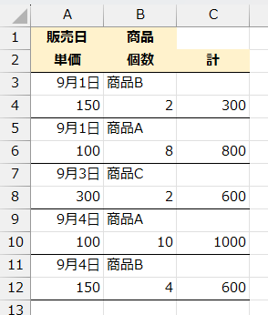 人間が見れば同じ列でも上段と下段で違うものが入っているというのがわかります。しかし、Excelにとっては、A列が販売日なのか単価なのかわかりません。B列は商品なのか個数なのかわかりません。このようにExcelは1つの列には1つの項目しか入っていないとしか認識できないと考えるのが基本です。